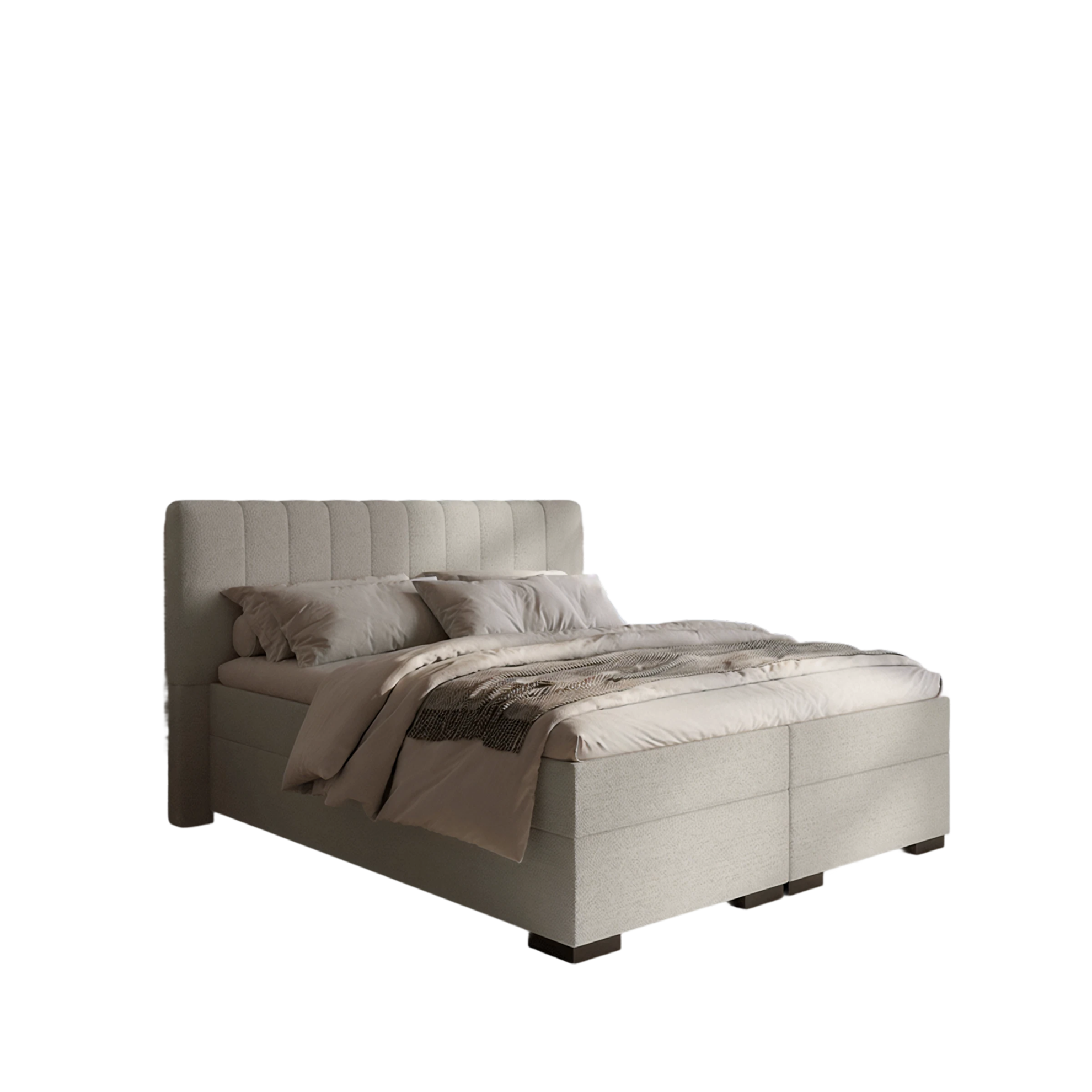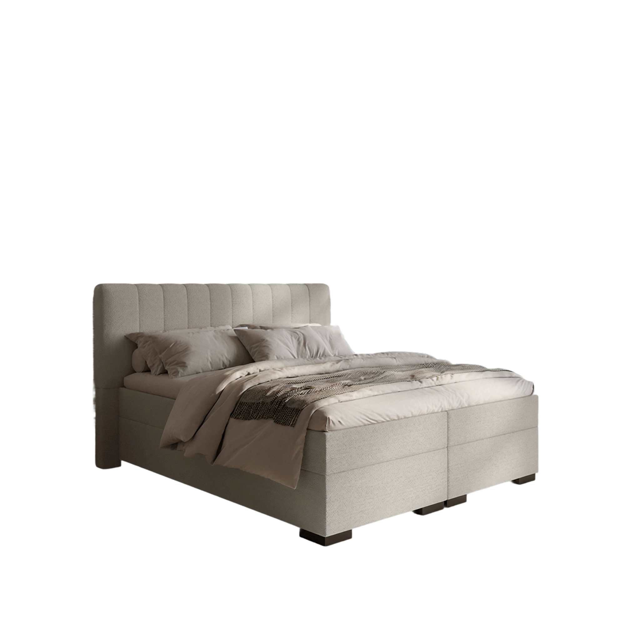 De boxspring Benjamin is voorzien van een stijlvol hoofdbord met verticale stiksels en een