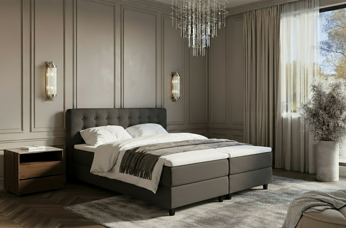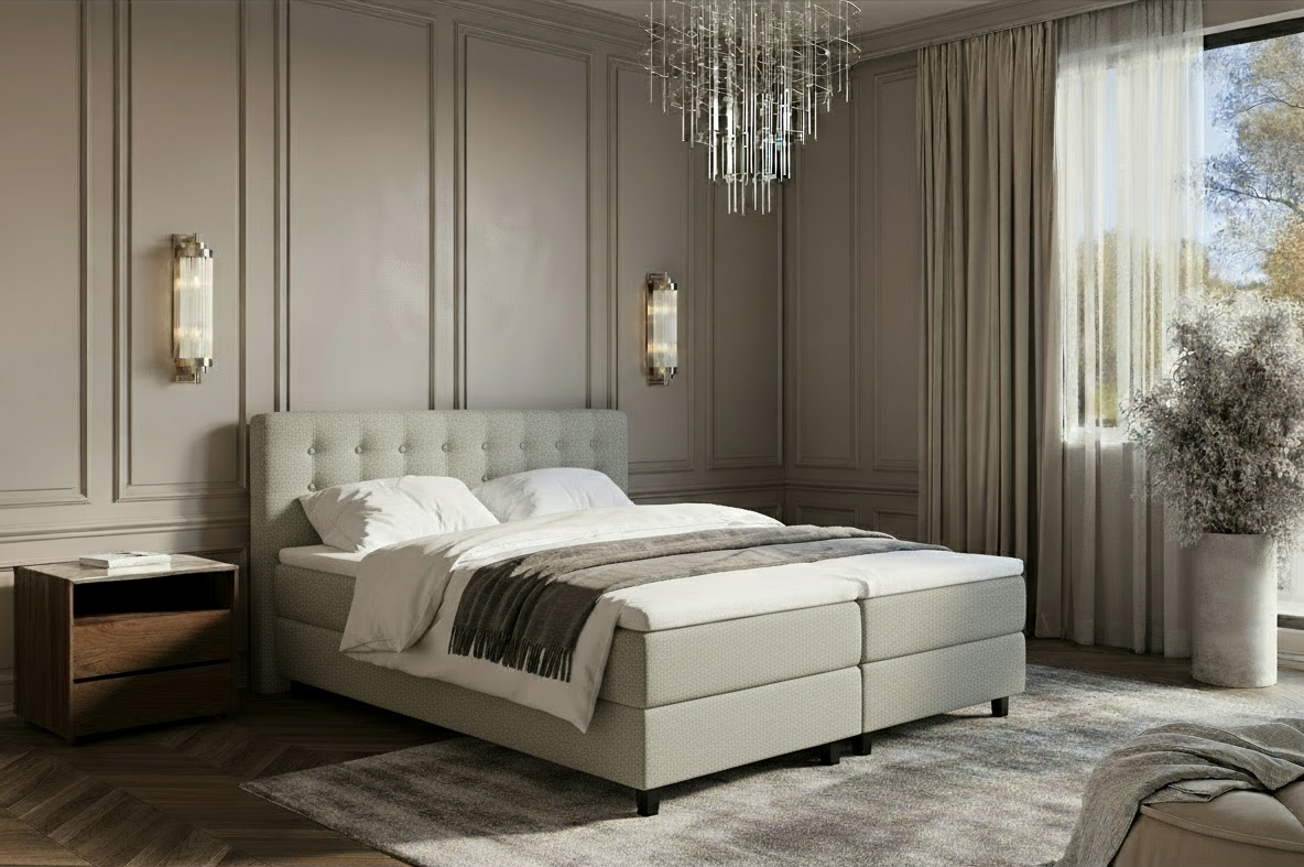 De boxspring Nora valt op door het prachtig geknoopte hoofdbord van 1,0 meter hoog, dat luxe en elegantie uitstraalt. Het verfijnde design met stijlvolle knoopdetails geeft de slaapkamer een warme, klassieke uitstraling met een moderne twist. Dankzij de zachte stoffering en hoogwaardige afwerking biedt de Nora niet alleen een elegante look, maar ook optimaal comfort. Kies uit enkele zorgvuldig geselecteerde stoffen en kleuren om het bed perfect af te stemmen op jouw interieur.