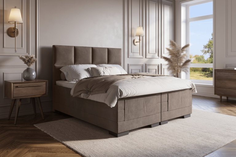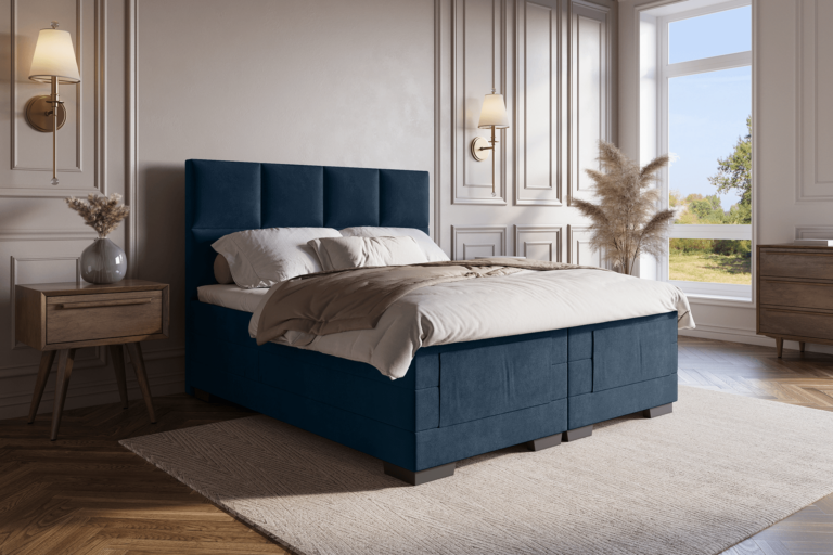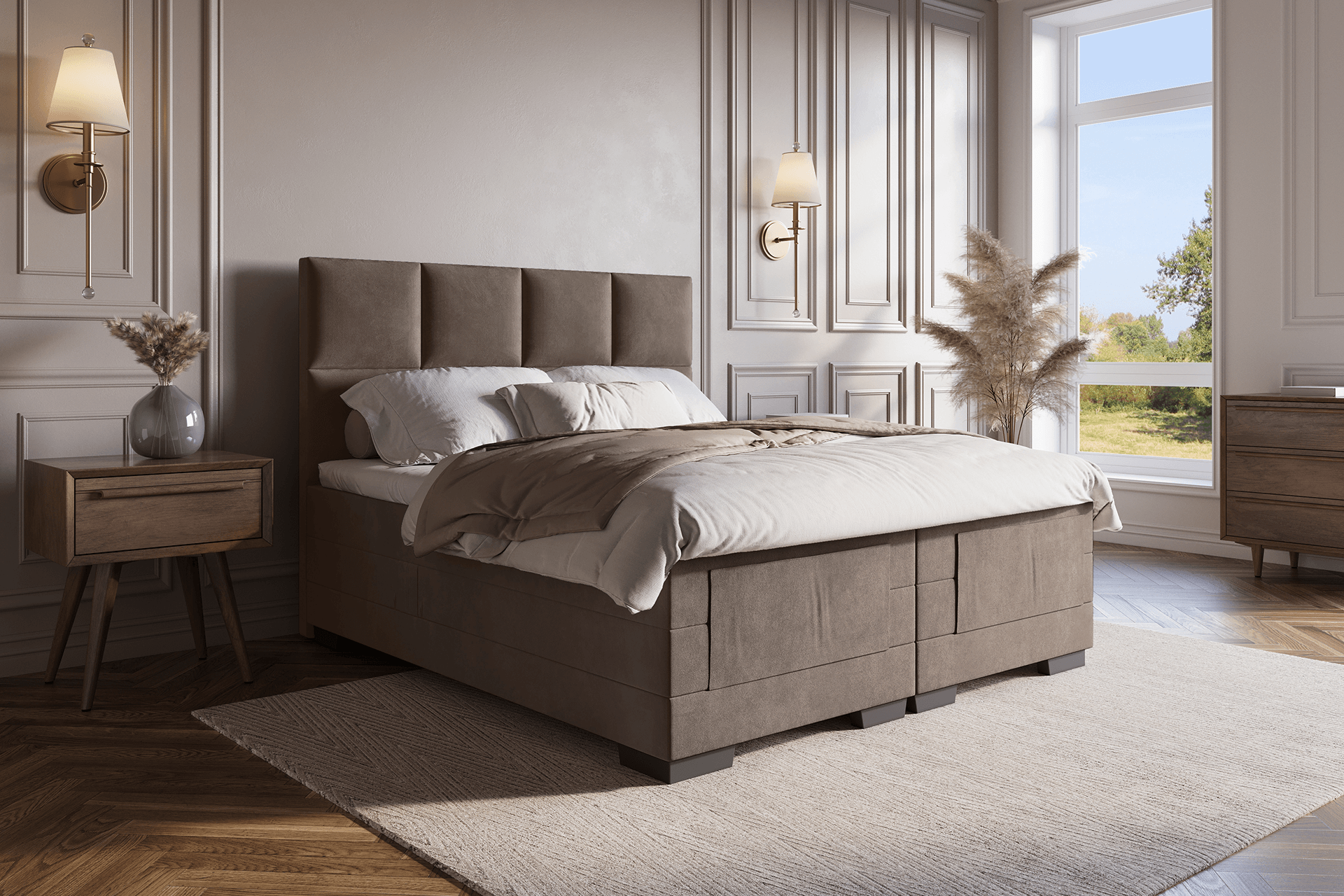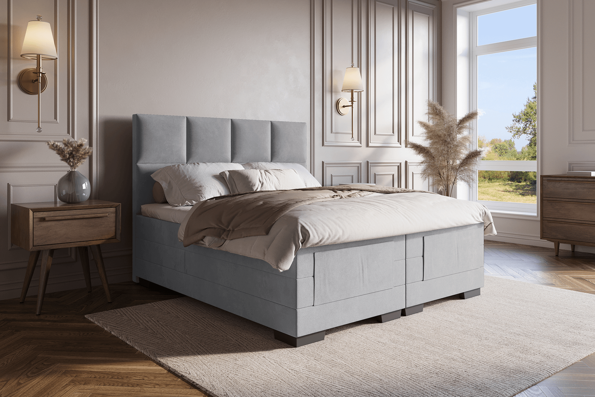 De boxspring Senna heeft een hoofdbord met acht vakken van 1,2 meter hoog. Het strakke en symmetrische ontwerp zorgt voor een rustige en luxe uitstraling, die goed past in zowel moderne als klassieke slaapkamers. De boxspring Senna is geheel naar wens samen te stellen, met keuze uit verschillende stoffen, kleuren, poten en matrassen. Daarnaast is het mogelijk om te kiezen voor een bijpassend voetbord met acht vakken of een TV-lift, voor extra comfort en een luxe uitstraling in de slaapkamer.