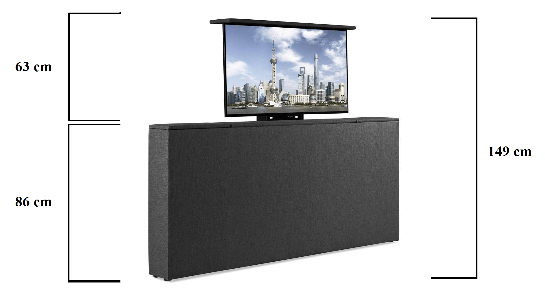 Dit 86 cm hoge TV-meubel is met een luxe meubelstof door onze eigen fabriek gestoffeerd. Je hebt de keuze uit 15 verschillende kleuren opties en 4 verschillende breedtematen, om het voetbord/tv-meubel perfect te laten matchen met jouw bed. Televisies met een schermgrootte tot en met 43 Inch kunnen gemakkelijk worden gemonteerd. De elektrische tv-lift kun je bedienen met de meegeleverde draadloze afstandsbediening en kan worden versteld tot op iedere gewenste hoogte. Dit TV-meubel zorgt voor een extra luxe uitstraling in jouw slaapkamer en draagt bij aan extra gemak en comfort.